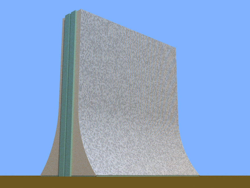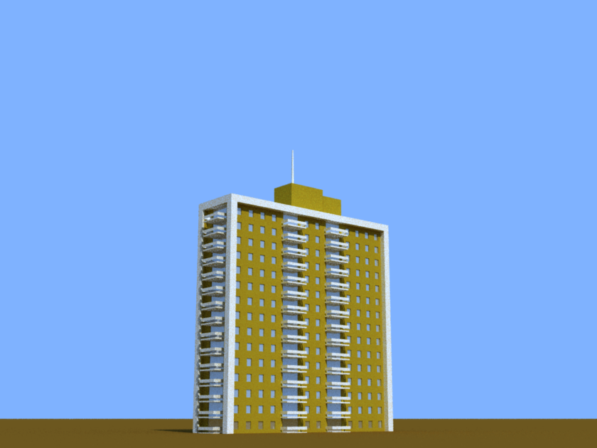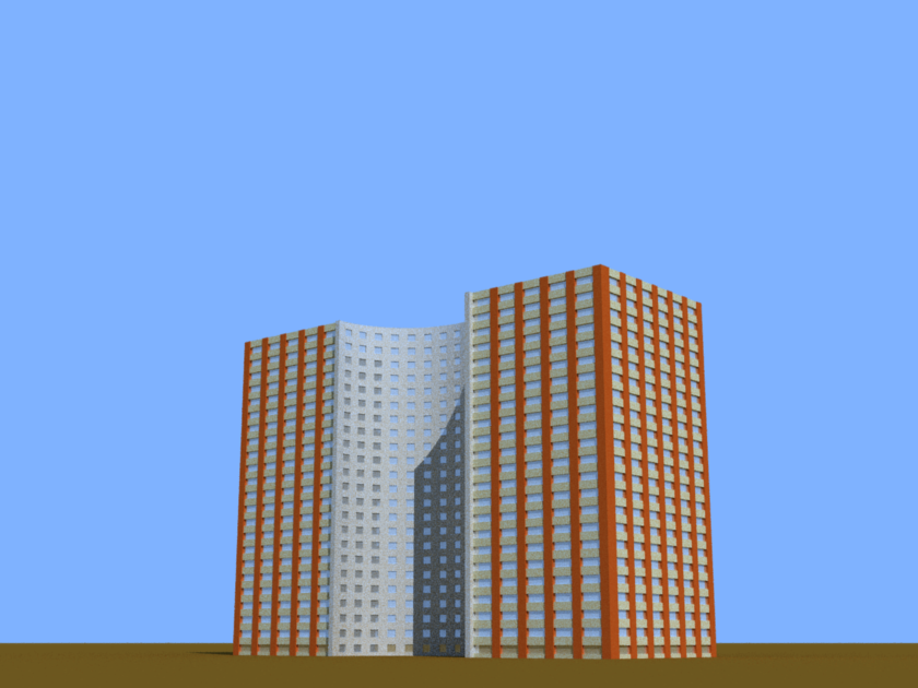 A grey block of a building with rounded corners.