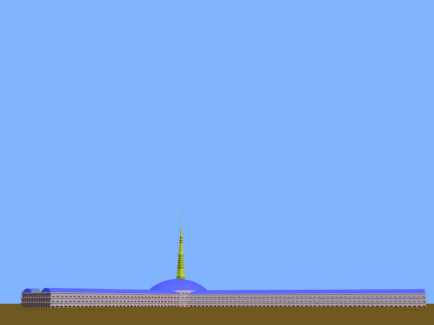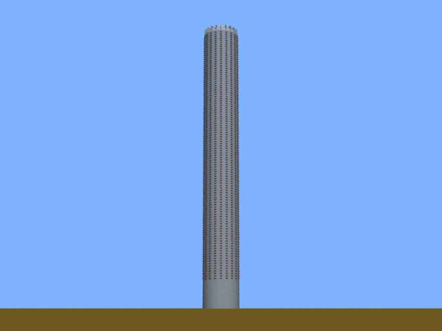 A cylindrical building with balconies and a decorative top. Designed in collaberation with my students.