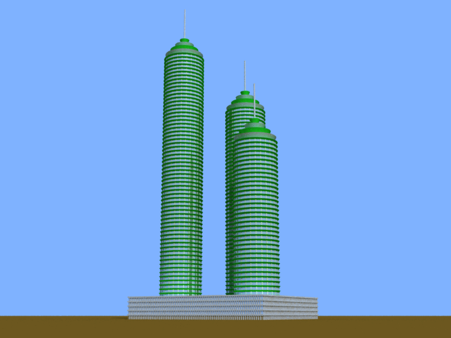 Three towers on a common base.