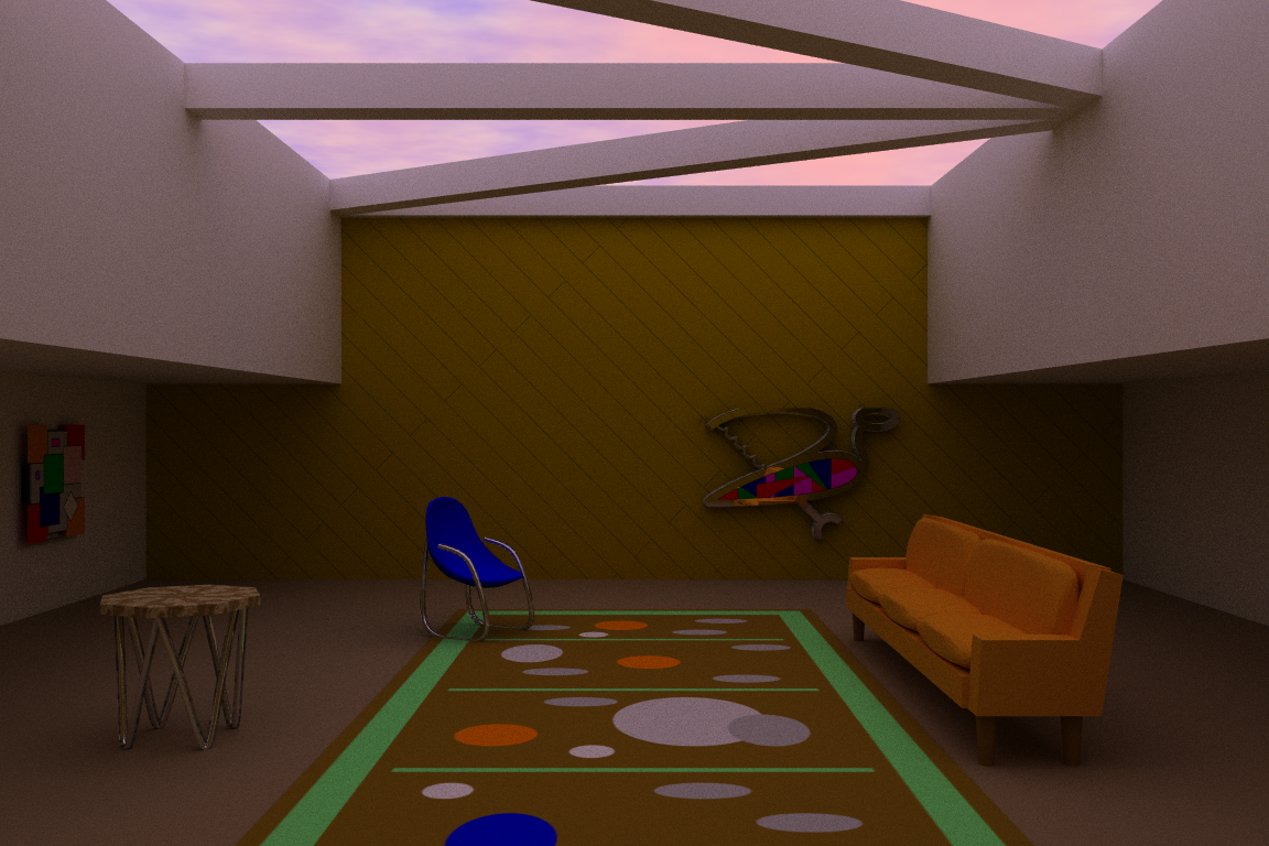 Modern Room (Febuary 2008) An experiment with many things contributing to photorealism. I designed this place as a quiet space in the calm of dusk, a place to sit for a few moments and just exist. I must say that it is inspired in part by the library of my junior high, which had windows that showed only the sky, and hidden nooks around the edges.