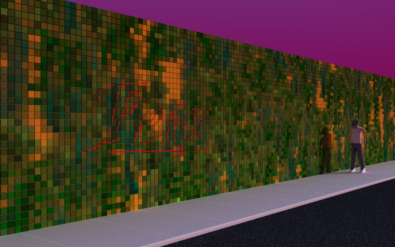 Wall with human figure (June 2008) My first real attempt at modeling the human figure, in an unexpectedly urban setting. This image realy grew from simple beginings to a more complex work of art.